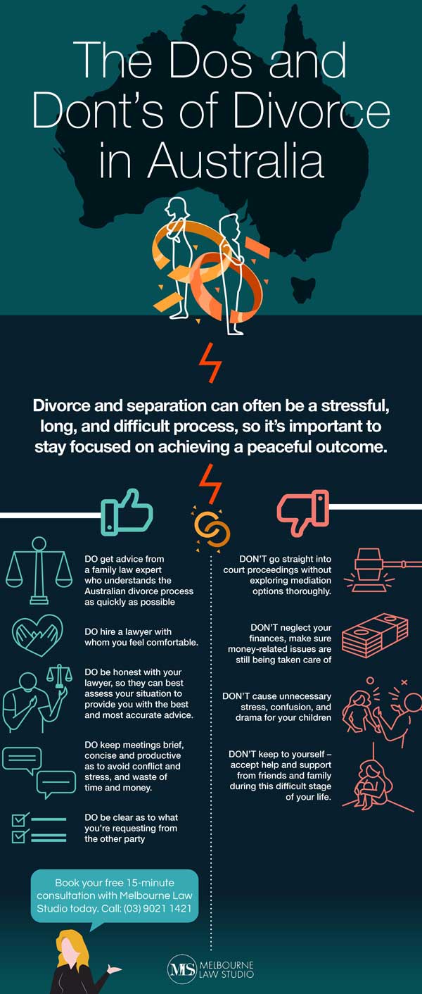 Divorce and separation is often a stressful time in people’s lives. It can be a long and difficult process, so it’s important to stay focused on achieving a peaceful outcome. Melbourne Law Studio, experts in family law, provide you with some dos and don’ts of divorce in Australia to ensure you a successful divorce settlement.